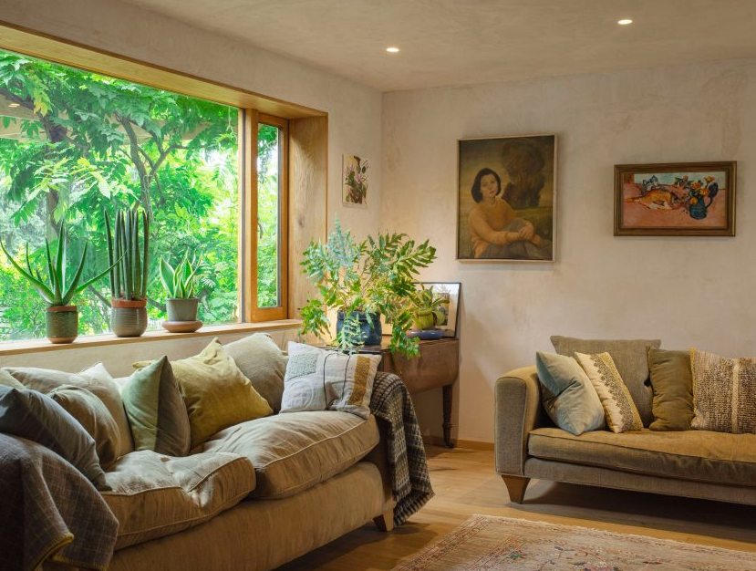진저브레드 하우스의 확장 부분의 벽과 천장은 거친 석고 마감으로 처리되었으며, 이는 개조된 리셉션에서도 이어지고, 목재 프레임, 가구, 내장형 수납장과 잘 어우러집니다. 또한, 바닥 난방, 삼중 유리창, 공기 열원 펌프를 도입하여 주택의 에너지 효율성도 향상되었습니다.