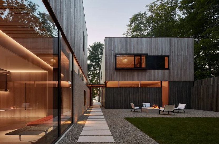 시카고에 기반을 둔 건축 스튜디오 Wheeler Kearns Architects는 미시간 호수의 "자연의 아름다움과 평온함"에서 영감을 받아 세 개의 독립적인 구조물로 이루어진 나무 래핑 호숫가 주택을 설계했습니다. 이 집은 2022년 8월 완공된 Meadow Lane Retreat로, 미시간의 숲이 우거진 부지에 위치해 있습니다.