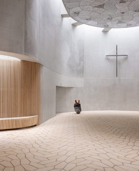 예배용 제단은 밝고 자연스러운 톤을 지닌 애쉬 목재로 만들어졌으며, 이는 도자기 타일 바닥과 노출된 콘크리트 벽과 조화를 이룹니다. 주요 예배 공간에서는 덴마크의 개념 예술가 Henrik Plenge Jakobsen이 만든 큰 구멍이 뚫린 십자가가 중심에 자리잡고 있으며, 북쪽 십자성 자리를 통합한 이 작품은 교회 주변을 둘러싼 천창에서 제공되는 부드러운 자연광에 의해 강조됩니다.
