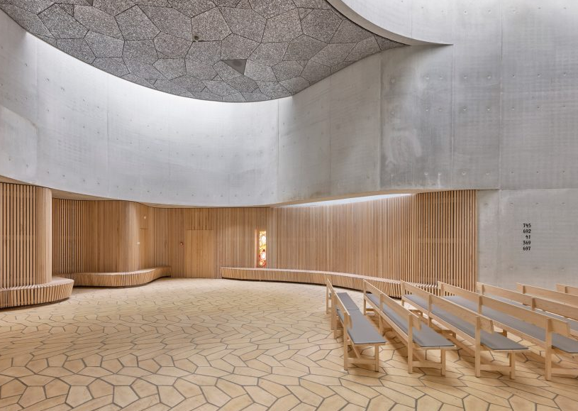 주 예배 공간의 천장은 물 분사 절단기로 재활용된 캔을 사용하여 만들어졌으며, 이는 빛을 반사하고 소리를 흡수하는 이중 기능을 수행하여 교회 내부에 "고요하고 명상적인 분위기"를 조성합니다. 라이트 애쉬 우드로 제작된 맞춤형 벤치가 교회의 곡선 벽을 따라 배치되어 있으며, 슬랫 애쉬 패널이 벽면에 설치되어 있습니다.