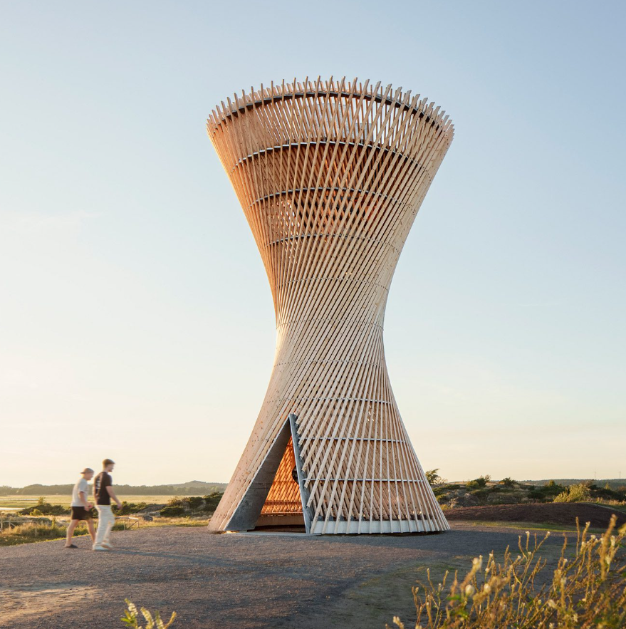 스웨덴 건축 스튜디오 화이트 아키텍터(White Arkitekter)는 "뒤틀린 짚다발"을 닮은 목재 빔 네트워크로 구성된 관측탑, 케르벤(Kärven) 관측탑을 완성했습니다. 이 탑은 스웨덴의 게테론(Getterön) 자연 보호구역에 위치하고 있으며, 12미터 높이와 7미터 너비를 자랑하는 이 탑은 금속 링과 결합된 140개의 목재 빔으로 구성된 쌍곡면 구조를 가지고 있습니다.