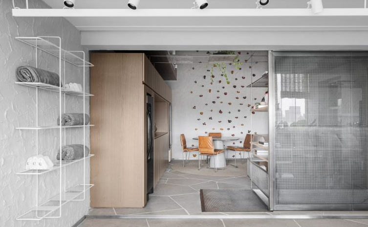 이 아파트의 핵심적인 특징 중 하나는 바로 거실에 설치된 암벽등반벽입니다. 나티 미나스 & 스튜디오와 가브리엘라 메스트리너는 거실의 한 벽면에 다양한 색상의 손잡이와 발 디딤대를 설치해, 아파트 상부의 경사진 천장까지 도달할 수 있도록 디자인했습니다. 이러한 디자인은 거실의 더블 하이트(double-height) 구조를 최대한 활용하며, 입주자들이 집 안에서도 스포츠 활동을 즐길 수 있게 합니다.