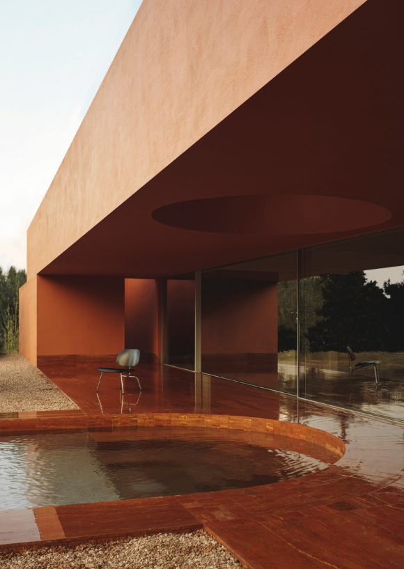 주택의 붉은 외관은 주변 토양의 색상을 닮도록 디자인되었습니다. 자갈로 깔린 안뜰 중앙에는 긴 수영장이 자리하고 있으며, 이는 메인 건물을 향해 연장되어 원형 천창이 있는 오버행으로 덮인 포치로 이어집니다. 이 포치는 거대한 유리문을 통해 개방형 거실과 분리되어 있으며, 거실은 다이닝 공간과 초록색 톤의 캐비닛과 황동 표면이 특징인 주방으로 확장됩니다.