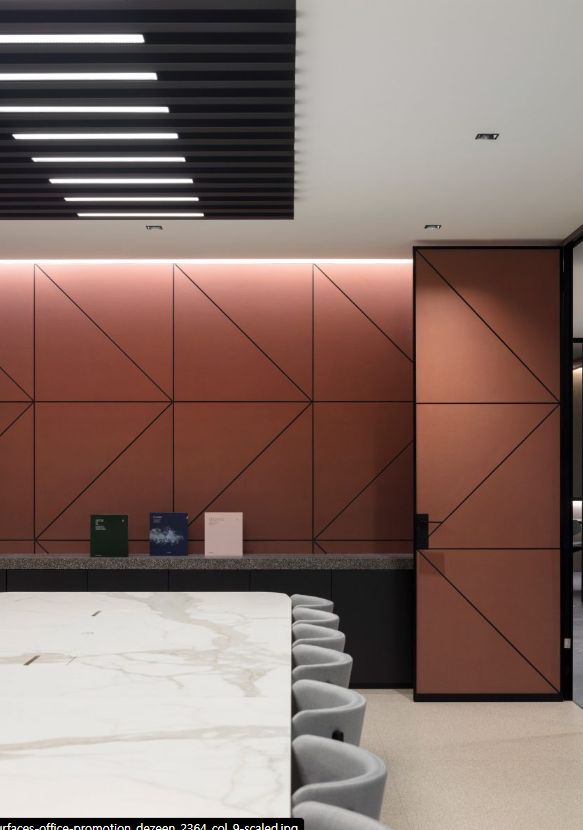 피안드레의 세라믹 서피싱은 3층에 걸쳐 바닥을 덮고 있으며, 여러 벽, 세면대 및 맞춤형 데스크, 회의 테이블, 바 카운터 및 커피 테이블에 사용되었습니다. 이러한 요소들은 모두 사무실을 더욱 세련되고 우아하게 보이도록 설계되었습니다.