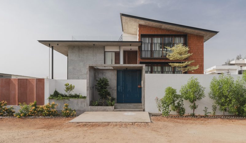 이 집의 상부 경사 지붕 아래에는 붉은 벽돌로 코팅된 액센트 벽이 있어 외관에 자연스러운 느낌을 더합니다. 이는 인근 코코넛 농장의 붉은 흙을 반영하기 위해 수직으로 세워진 벽돌들로 구성되어 있으며, 코임바토레의 식민지 시대를 상징하는 역할을 합니다.