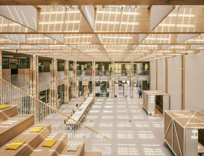 중앙 아트리움과 개방된 내부 공간에서 유연한 작업 환경을 조성하기 위해 아틀리에 뒤 퐁은 개인 "작업 셀"과 이동식 "왜건 셀", 그리고 사무실 파티션 등의 재구성 가능한 마이크로 건축물들을 설계했습니다. 이러한 구성 요소들은 사무실 공간을 쉽게 재배치할 수 있게 해주며, 내부 전체에 걸쳐 자연광에 대한 접근성을 유지하는 데 기여합니다.