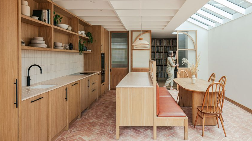 Benjamin Wilkes 스튜디오는 “이 집의 재료는 대부분 자연적이거나, 재활용된 자재들로 구성되어 있습니다. 오크 나무 캐비닛, 테라코타 바닥, 테라조 작업대, 코냑 가죽 벤치 등이 주된 재료입니다”라고 설명했습니다.