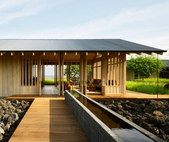 하와이의 카우아이 섬 북쪽 해안에 위치한 Hale Napo'o는 전통적인 하와이 건축 양식을 현대적으로 재해석한 주택입니다. 넓은 처마와 나무로 된 폭풍 셔터는 하와이의 기후 조건을 잘 반영하고 있으며, 주택을 보호하는 동시에 자연광과 바람을 활용해 실내를 시원하게 유지합니다.