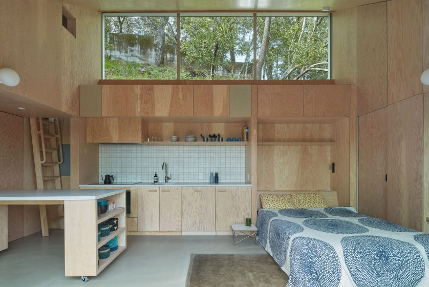캘리포니아의 모르크-울네스 아키텍츠(Mork-Ulnes Architects)는 마린 카운티 산악 지대에 위치한 이 38제곱미터 크기의 게스트하우스를 위해 두 개의 유연한 가구를 디자인했습니다. 하나는 벽에서 접어 나오는 침대이고, 다른 하나는 이동 가능한 주방 섬입니다.