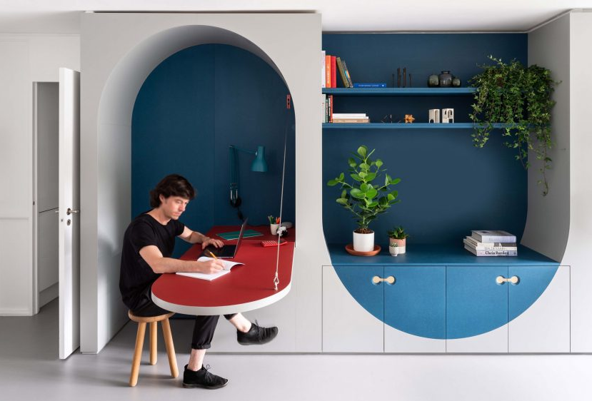 런던의 브루탈리스트 바비칸 아파트 단지 내에서 스튜디오 벤 앨런(Studio Ben Allen)이 리노베이션한 이 집은 작업 공간과 어린이 방을 겸할 수 있는 가변적인 조립 유닛을 특징으로 합니다. 이 유닛은 천장에서 바닥까지 이어진 파티션 벽 역할을 하며, 한쪽에는 빨간색 접이식 책상이, 다른 한쪽에는 벙커 침대와 그 아래로 접이식 안락의자가 있습니다.