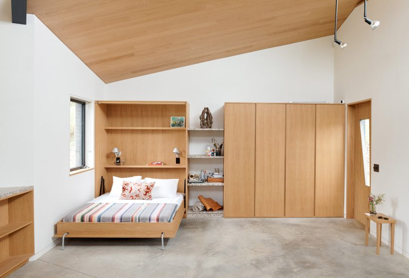 브루클린의 GRT 아키텍츠(GRT Architects)가 설계한 이 스튜디오 스타일의 뉴욕 더치스 카운티 홈에서는 머피 침대를 통해 거실이 침실로 변신합니다. 침대는 접어둘 때 나머지 벽을 따라 나무 캐비닛처럼 보이지만, 펼치면 선반과 램프가 그 뒤에서 드러납니다.