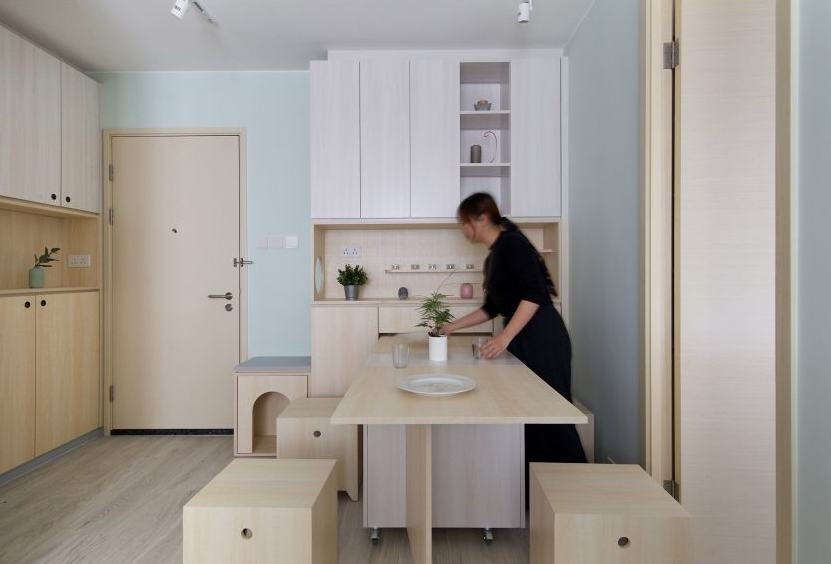 심플렉스 디자인 스튜디오(Sim-Plex Design Studio)는 이 작은 홍콩 아파트의 배치를 설계할 때, 주인이 키우는 두 마리 애완동물(앵무새와 고양이)을 분리하여 보관할 수 있도록 고려했습니다. 이를 위해 주방 캐비닛에서 슬라이드 아웃 형태로 나오는 다이닝 테이블을 포함한 유연한 가구를 설계했습니다.