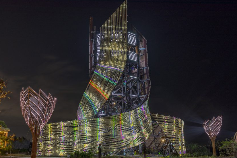 타워는 밤이 되면 더욱 특별한 모습을 보여줍니다. 발리와 두바이 기반의 멀티미디어 제작 회사 Delivered가 개발한 AI 기반의 빛과 프로젝션 쇼가 타워 전체에 펼쳐집니다. 이 빛의 쇼는 타워의 지속 가능성 메시지에 반응하여 변화하며, 1,000개 이상의 조명 장치와 18개의 프로젝터, 12개의 미니 타워에 설치된 사운드 시스템이 함께 어우러져 독특한 경험을 제공합니다.