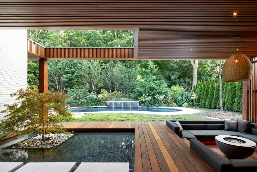 풍경 디자인은 바닥부터 천장까지 이어지는 창문을 통해 내부로 자연스럽게 녹아들며, 일본에서 영감을 받은 젠(Zen) 정원 스타일로 조성되었습니다. 이 정원은 푸른 잔디와 여러 물 요소들로 구성되어 있으며, 뒤뜰의 수영장도 포함하고 있습니다.