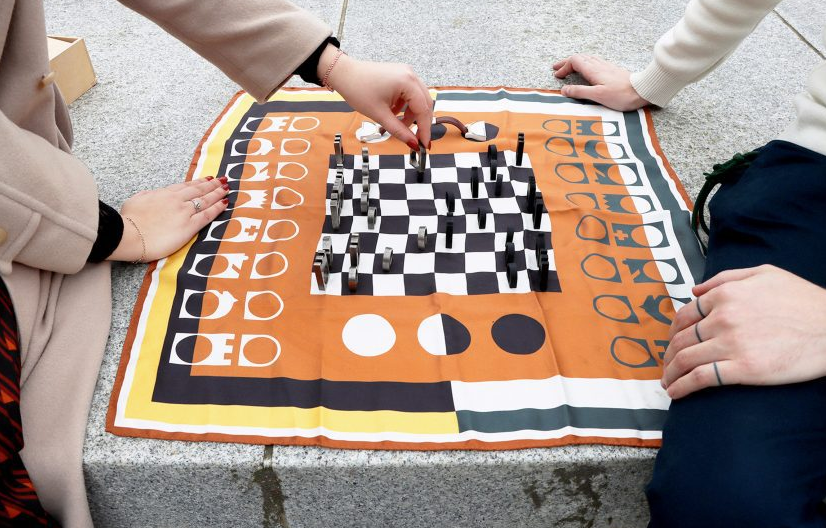 세노빌은 반지의 크기에 맞추어 체스판 크기를 결정했으며, 각 기물의 상징적인 디자인을 스카프 위에 그래픽 요소로 통합했습니다. 체스판으로도, 액세서리로도 활용 가능한 이 실크 스카프는 사람들에게 체스 게임을 드러내지 않고도 스타일리시하게 착용할 수 있는 아이템으로 제작되었습니다. 고급스러운 디자인과 세련된 색상이 돋보이며, 전통적인 체스 세트에서 영감을 얻은 색상인 금색, 갈색, 검정색이 조화를 이루어 고급스러운 분위기를 자아냅니다.