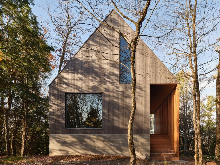 이 산장은 무스코카 지역의 숲 가장자리에 자리잡고 있으며, 아래쪽 호수를 내려다볼 수 있는 위치에 있어 자연과 완벽히 어우러져 있습니다. Toronto에 위치한 Dubbeldam Architecture + Design 스튜디오는 자연을 최대한 보존하면서 건축물이 그 속에 조화롭게 자리 잡을 수 있도록 신중한 설계를 진행했습니다. 전통적인 삼각형 형태를 현대적으로 해석한 이 산장은 이중 박공지붕을 채택하여 자연 경관과 일체감을 이루도록 합니다.