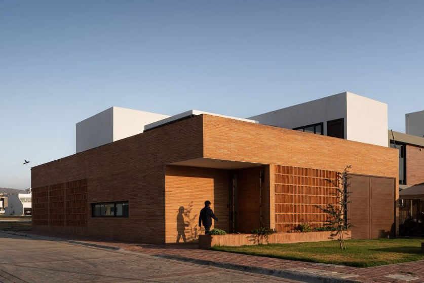 주택의 1층은 현지에서 수작업으로 제작된 붉은 벽돌을 주로 사용하여 지어졌습니다. 이 벽돌은 지역의 토양 색감을 반영하며, 낮 동안 열을 저장하고 밤에 방출하여 에너지 소비와 탄소 발자국을 줄이는 데 기여합니다.