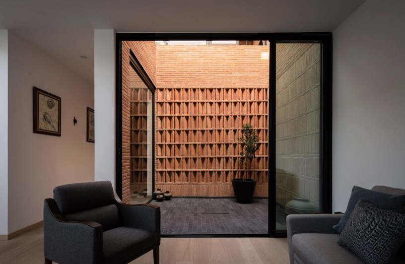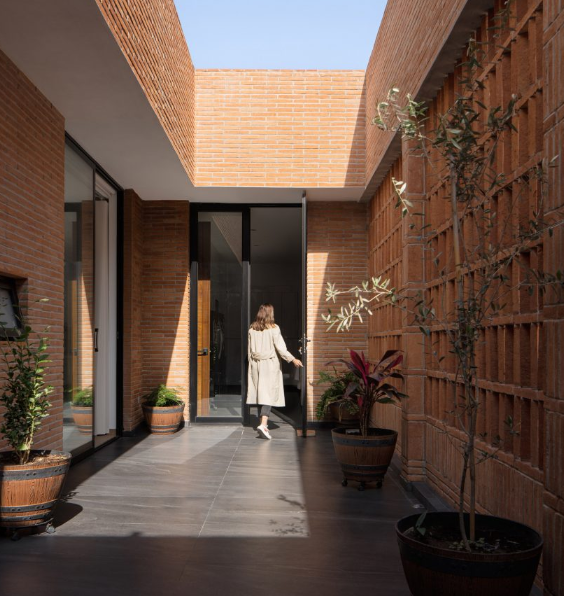목재 가구와 바닥은 공간에 자연스러운 질감을 더하며, 파티오의 회색 돌 타일은 붉은 벽돌과 녹색 식물에 현대적인 대비를 제공합니다. "열린 파티오와 테라스를 통해 자연과의 통합을 실현함으로써, 자연적인 그늘과 바람을 활용하여 인공적인 기후 조절의 필요성을 줄입니다."라고 덧붙였습니다.